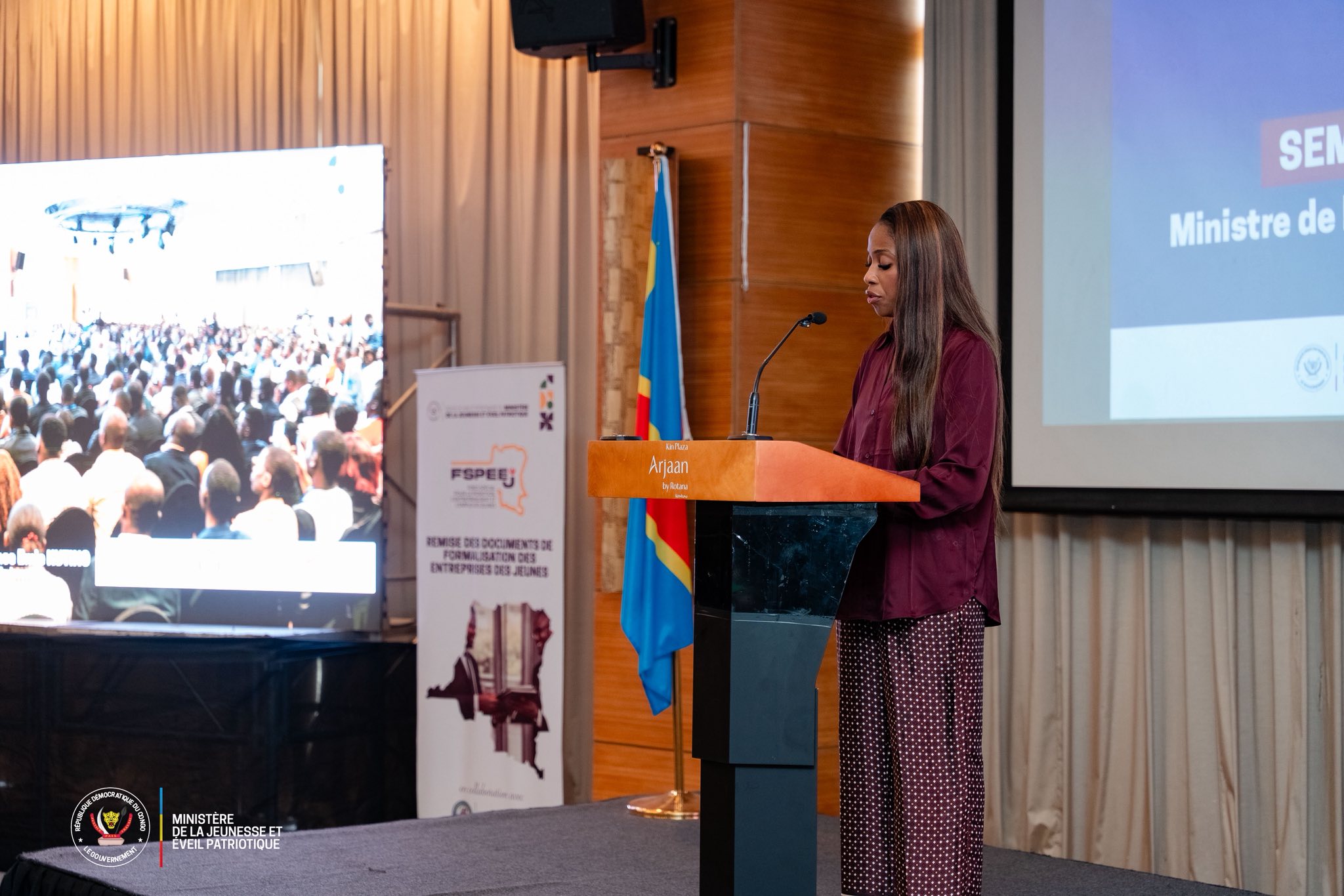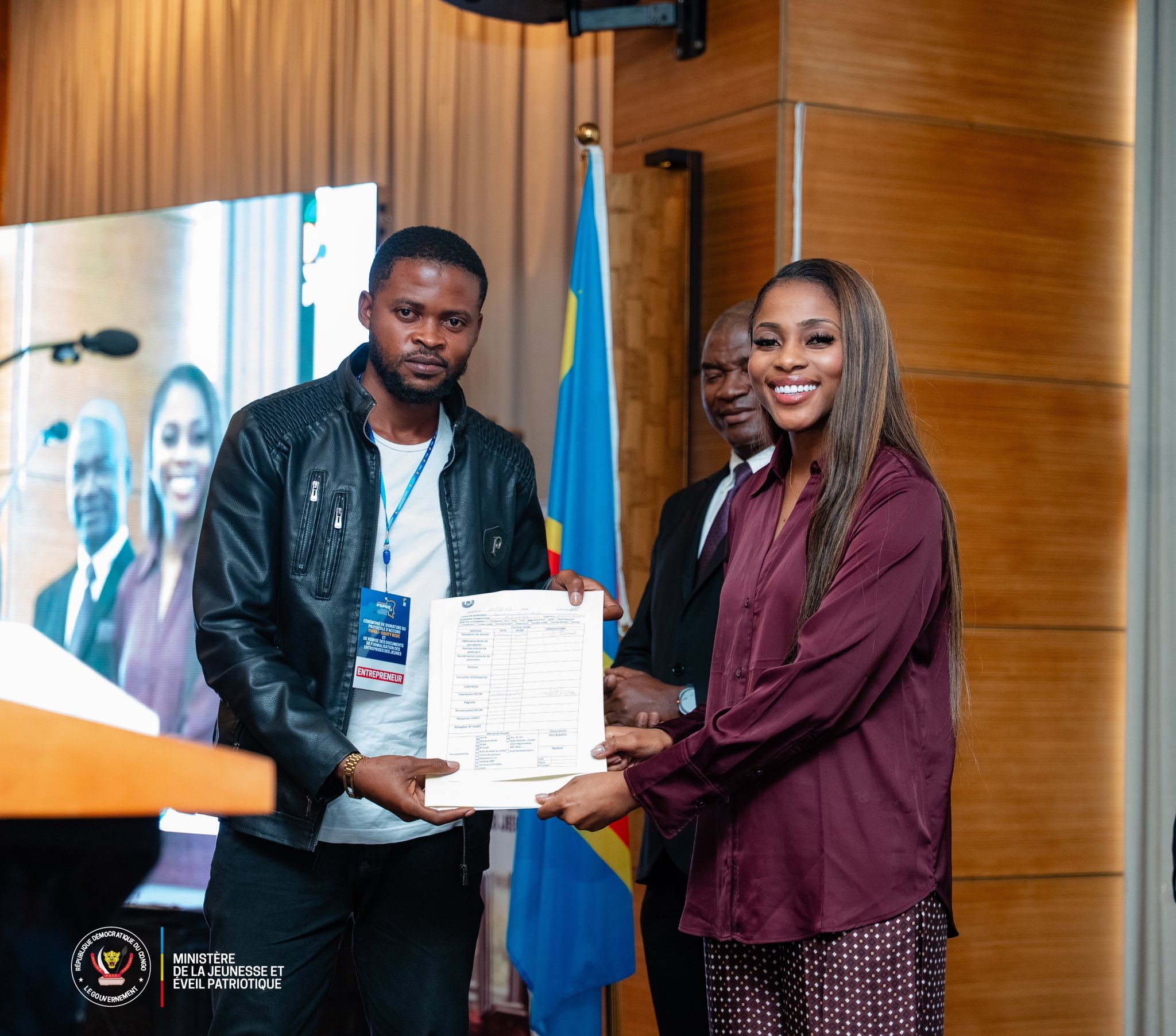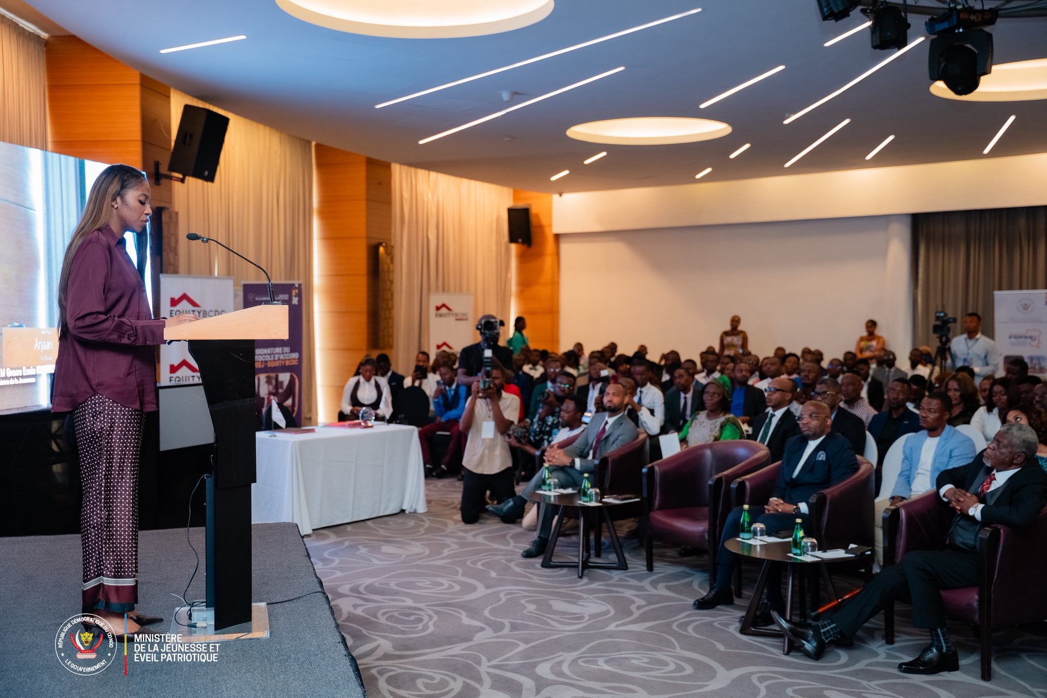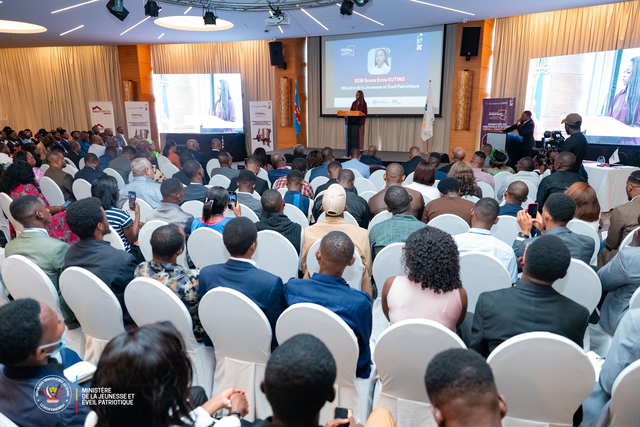 La Ministre de la Jeunesse et de l’Éveil Patriotique, Mme Grace Emie Kutino, a pris part à la cérémonie de signature du protocole d’accord entre le Fonds Spécial pour la Promotion, l’Entrepreneuriat et l’Emploi des Jeunes et Equity BCDC